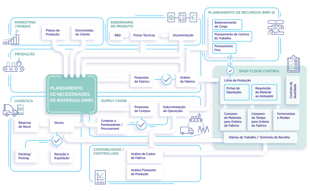 O software para a indústria gere todas as atividades do processo produtivo, desde a elaboração, compras de matérias primas, conceção de produto e e subcontratação, embalamento, até à entrega do produto acabado.